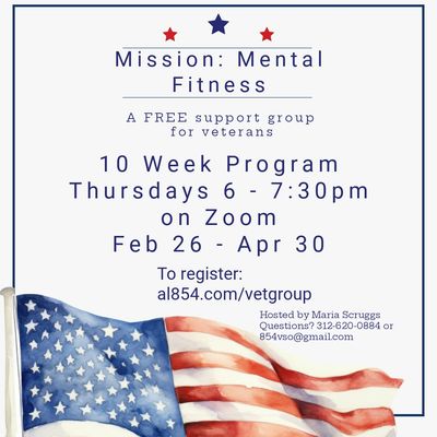 Join us on Thursday evenings for 10 weeks (6:30 pm to 8 pm CST) for a special event designed to enhance veterans' mental fitness. This event aims to provide veterans with support and resources to improve their overall well-being.